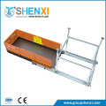 It consists of adjustable support prop, stationary frame, retractable platform, guardrail, safety door etc. The stationary frame is located on the floor slab of the building and a "H" frame in stationary frame is kept close to the slab edge; the movable deck rolls in or out on the stationary frame by the rollers fixed in the stationary frame and movable deck. To receive the material, rolls the movable deck out of the building edge. If don't use the platform, retract the deck back. The adjustable props support the platform between the two floors by transforming the load to the ceiling. Besides of above parts, there are the deck locking pin to lock the movable deck, side panels with safety lanyard line and door adjustment, front end doors with door lock, safety chain for longer loads. A foot operated leveling ramp is provided to allow the trolley roll up the deck.