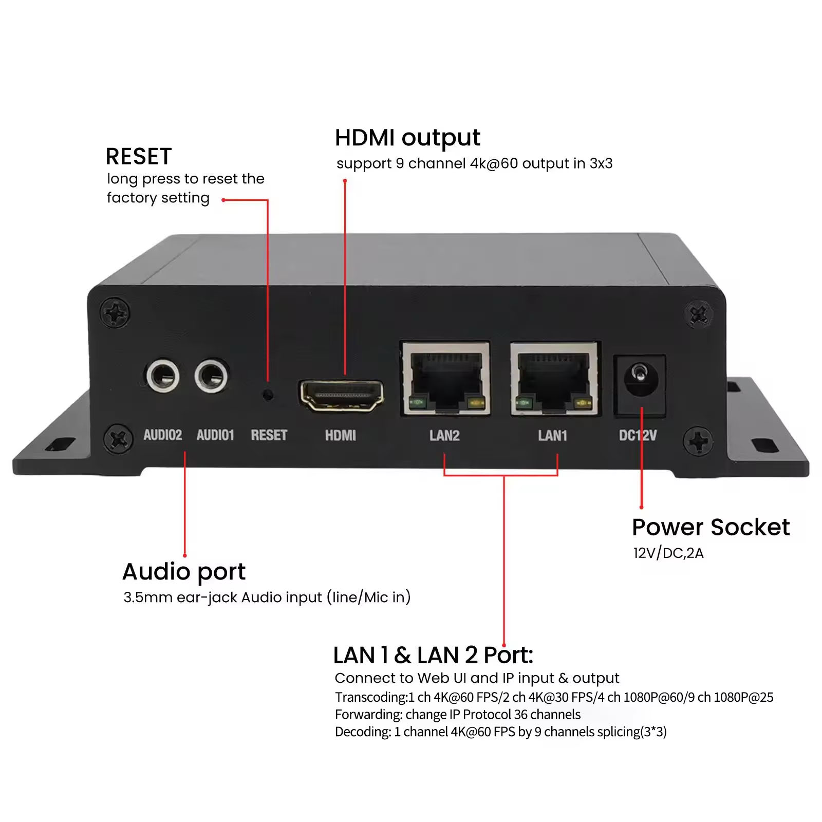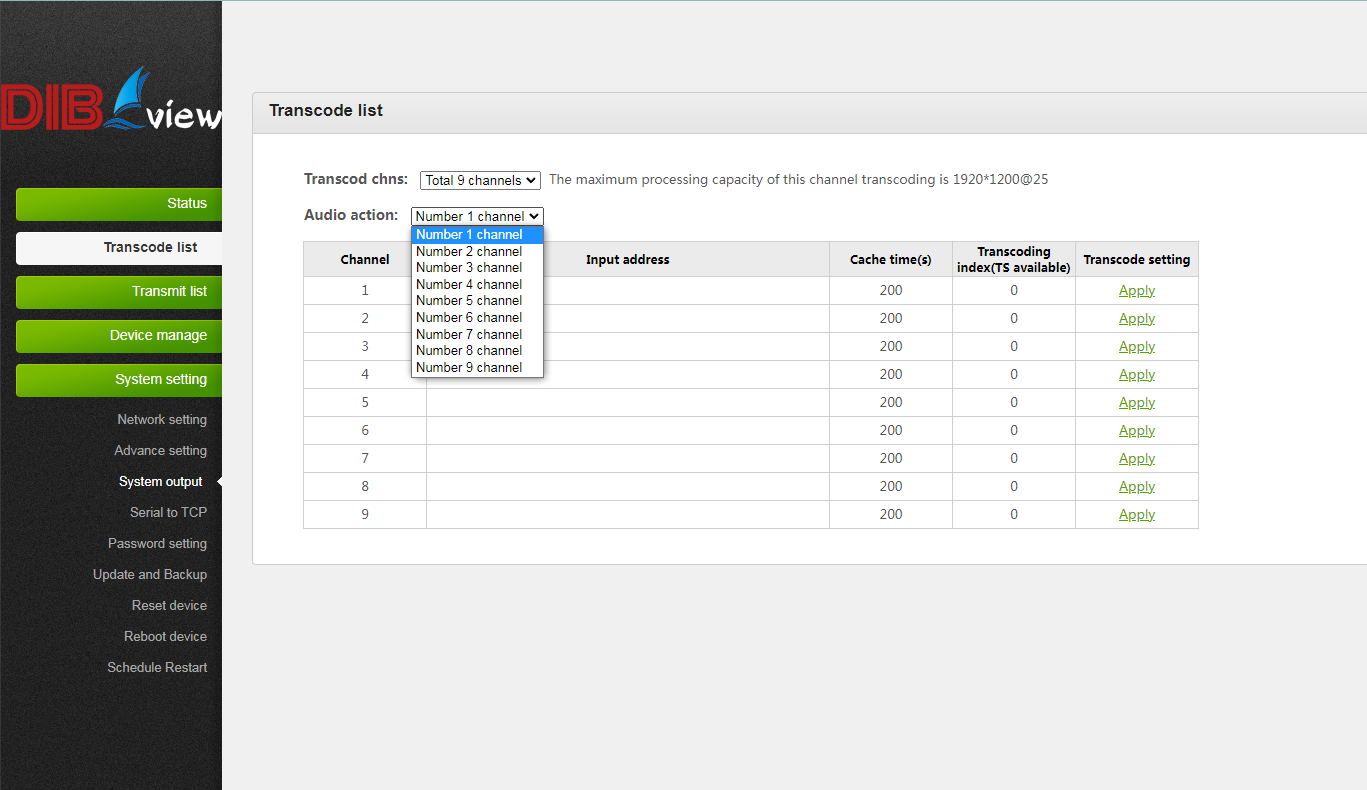 Channels:9 Transcoded streaming protocol:Support RTMP/ RTSP /HTTP TS/HTTP FLV/HLS/MP4/SRT/UDP Multicast/RTP Multicast | ||||||||