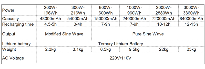 144Wh/240Wh/360Wh/480Wh/600Wh/720Wh/960Wh/2880Wh/3360Wh Power capacity, provides enough power to run essential devices for hours, depending on the actual output. ? ?*BMS SYSTEM: This system can improve the efficiency of the battery and extend the service life of the battery during the charging and discharging process. Safe, stable and efficient.And it has the short-circuit protection;overcurrent protection;overcharge protection;overdischarge prodution;so it is safety with your using. ? ?*WIDE COMPATIBLITY FOR HOME APPLIANCES ?compact station is powerful enough to meet different kinds of electricity demands outdoor usage for home, travel, camping, backseat on long road trips.The discharge rate and mode can be easily monitored and controlled via the LED digital display. ? ?*EASY TO CHARGE:?Never run out battery with power station. Our portable power supplier can either be charged through a wall outlet, through your car truck lighter socket or through a solar panel (of 50W 100W or others). ? *Provide Mostly Electric Appliances : Power your smartphone, tablet, laptop, camera,TV, light, drones, fans, Refrigerator,Kitchen Appliances in-car appliances, CPAP machine and more at anytime. |