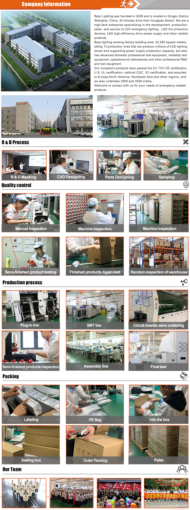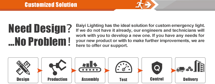 All of the designs in the Baiyi Lighting portfolio of Emergency Light, Emergency Exit Sign, Emergency Bulkhead, Emergency Twin Spot Light , Emergency Down light, Emergency Ceiling Light, Emergency Solar Light, Camping Light and Cabinet Light are fully and easily customized offering OEM high quality, cost effective options that meet their OEM application specific demands. Choosing to customize one of the lights in our portfolio, enables OEM to meet their custom lights requirements while allowing for faster development times. |
