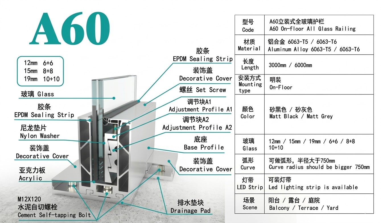 The A60 series is a high-performance on-floor glass railing solution designed for modern architectural aesthetics. As a premier Aluminum Railing System manufactured from premium 6063-T5/6063-T6 aluminum alloy, it provides a frameless, unobstructed view while maintaining superior structural safety. Its integrated LED channel design allows for creative lighting solutions, making it an ideal choice for high-end residential and commercial projects including balconies, terraces, and garden yards.