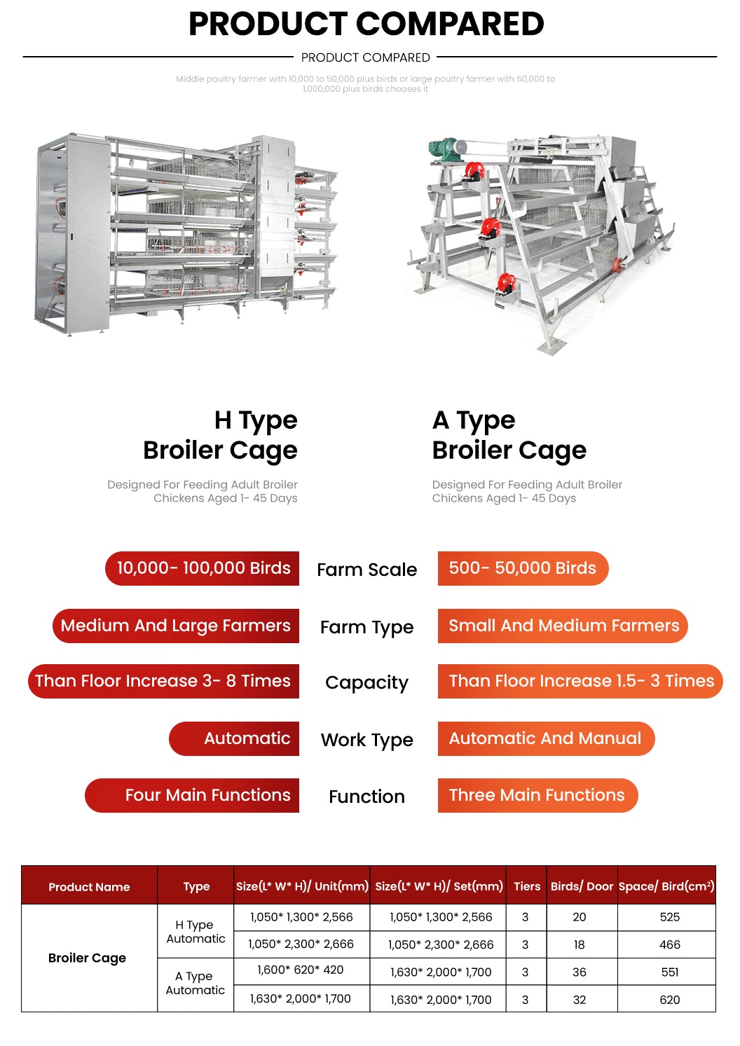 A-200 | 4tiers/ 5 doors | 200 birds | 5 birds | 2.0m*3m*1.95m | 40cm*40cm*40cm |