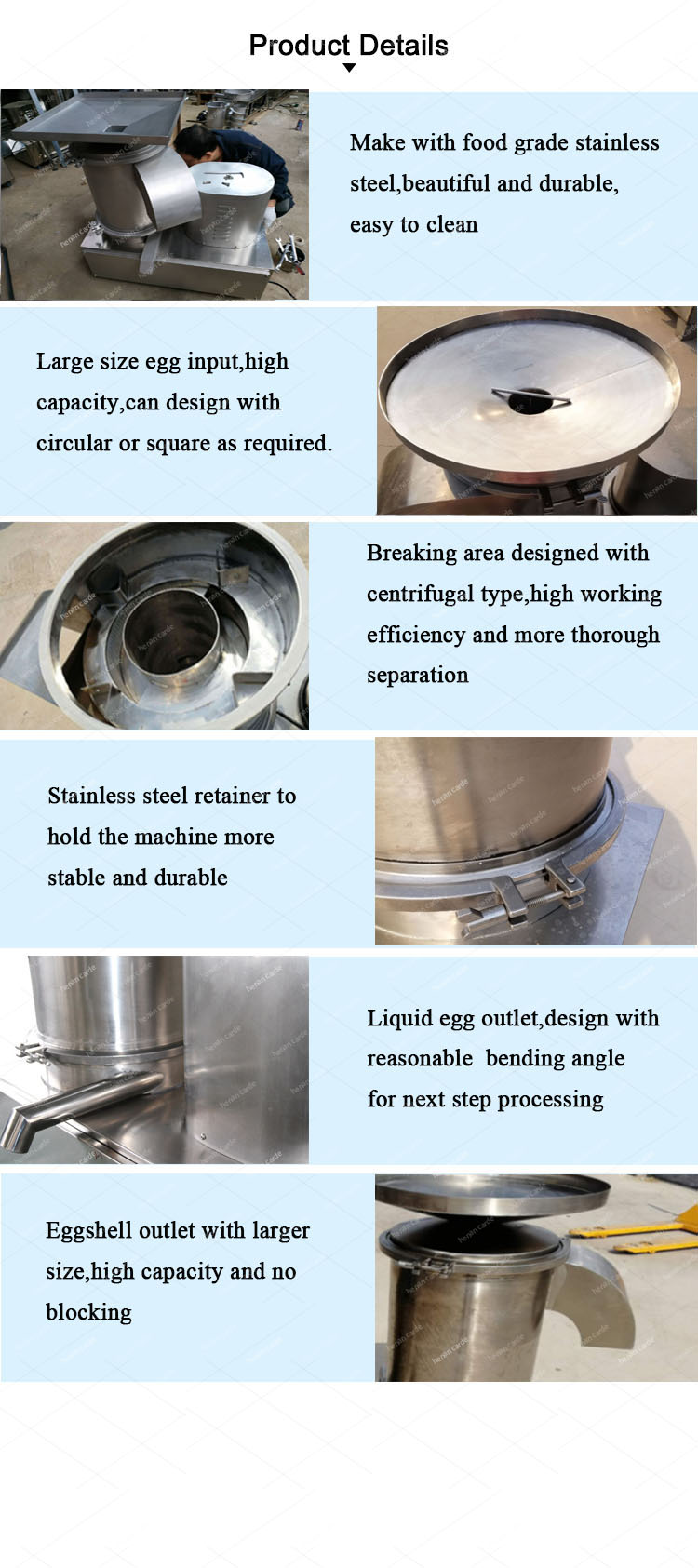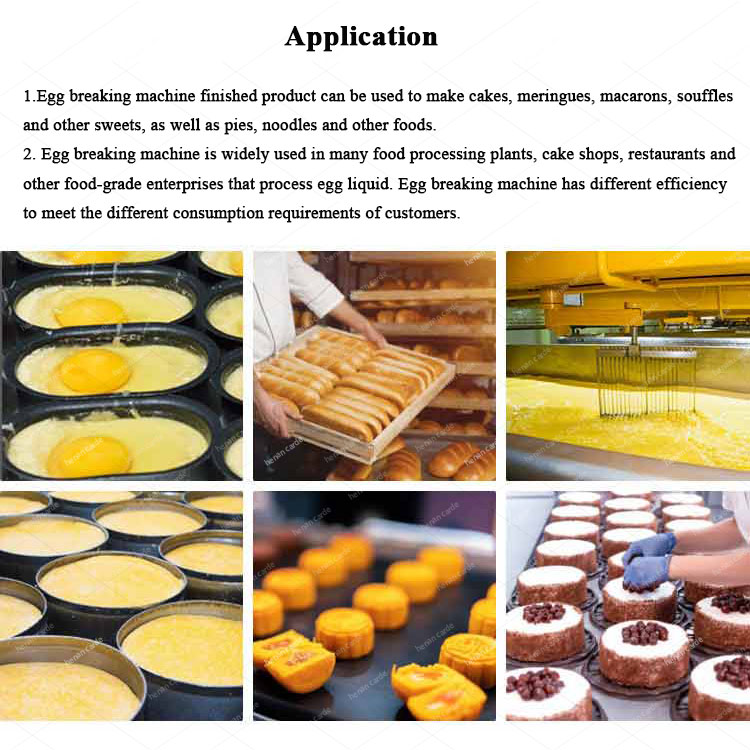 It is widely used in egg products processing machine,cake factory, big canteen and so on which need to process big quantity of eggs one time. | ||||||||