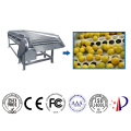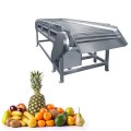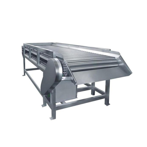 The machine consists of a frame, a drum (both ends of the stainless steel tube are sealed with engineering plastics), a waste fruit conveying device, a motor, a transmission system, and a tensioning device. During the conveying process of the machine, there are chains on both sides of the drum, the drum carries the raw material, the motor drives the chain to revolve, and the drum rotates on the frame due to the friction force between the two gears and the gasket. In this way, the raw materials are rolled 360° on the drum, which is convenient for workers to select the raw materials of fruits and vegetables. Unqualified raw materials can be placed in the waste fruit conveying area, fall forward with the conveyor belt into the waste hopper, and be transported out after collection. Qualified raw materials enter the next process from the discharge hopper.