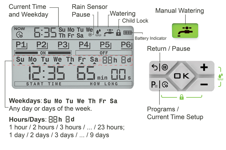 Super?Timing 6?Irrigation?system;three?different?watering?frequency;Large LCD Display;Auto?Sleep?Function; Child?Lock?etc., |