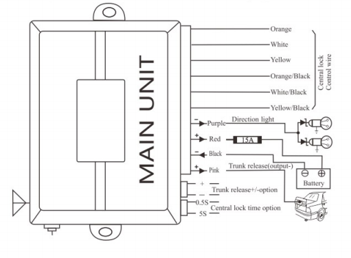 Main Features | ? Lock/Unlock ? Trunk release (negative) ? Trunk release +/- optional ? Electric/Vacuum central door lock optional ? Remote control programmable ? 10-Pin & 12-Pin ? Blue tooth upgrade optional ? Blue tooth PKE Upgrade optional ? Direction light ? Car find |