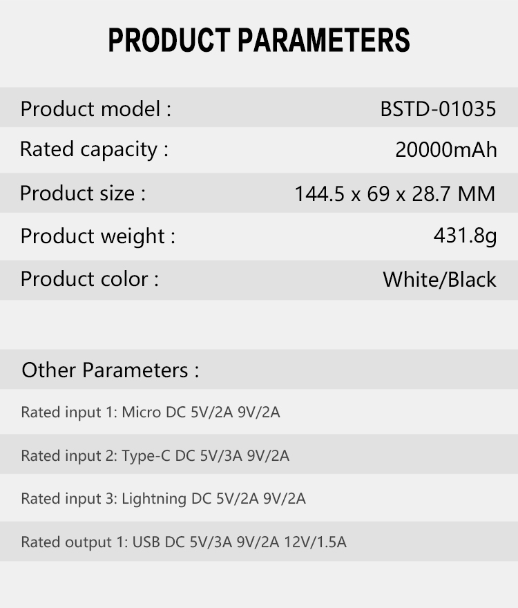 Input | Micro USB : 5V/2A 9V/2A? Type-C USB : 5V/3A 9V/2A Lightning USB : 5V/2A 9V/2A | Feature | portable, large capacity, double USB |