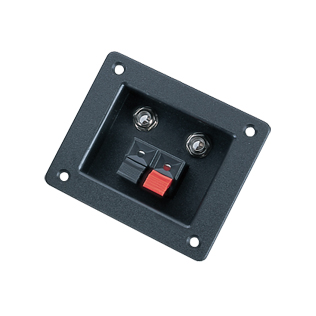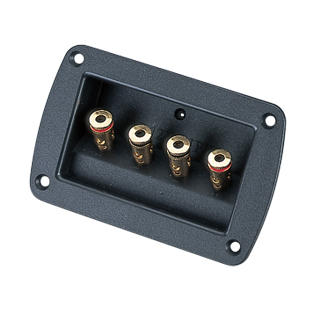 Gold-plated brass terminal posts, one with a red and one with a black knob on a twin base having one part red and one part black, so that the part on the outside of the chassis can be either red or black. Rated 10A at 250V. Each post has a 4mm top socket and a 2 1mm dia. hole in post. Knob size 16 x 15mm dia. Fits panels from 1 2mm dia. to 7mm thick. Panel cut-out requires two 12 7mm holes on 18 5mm centres. Bezel size 35mm x 16mm.