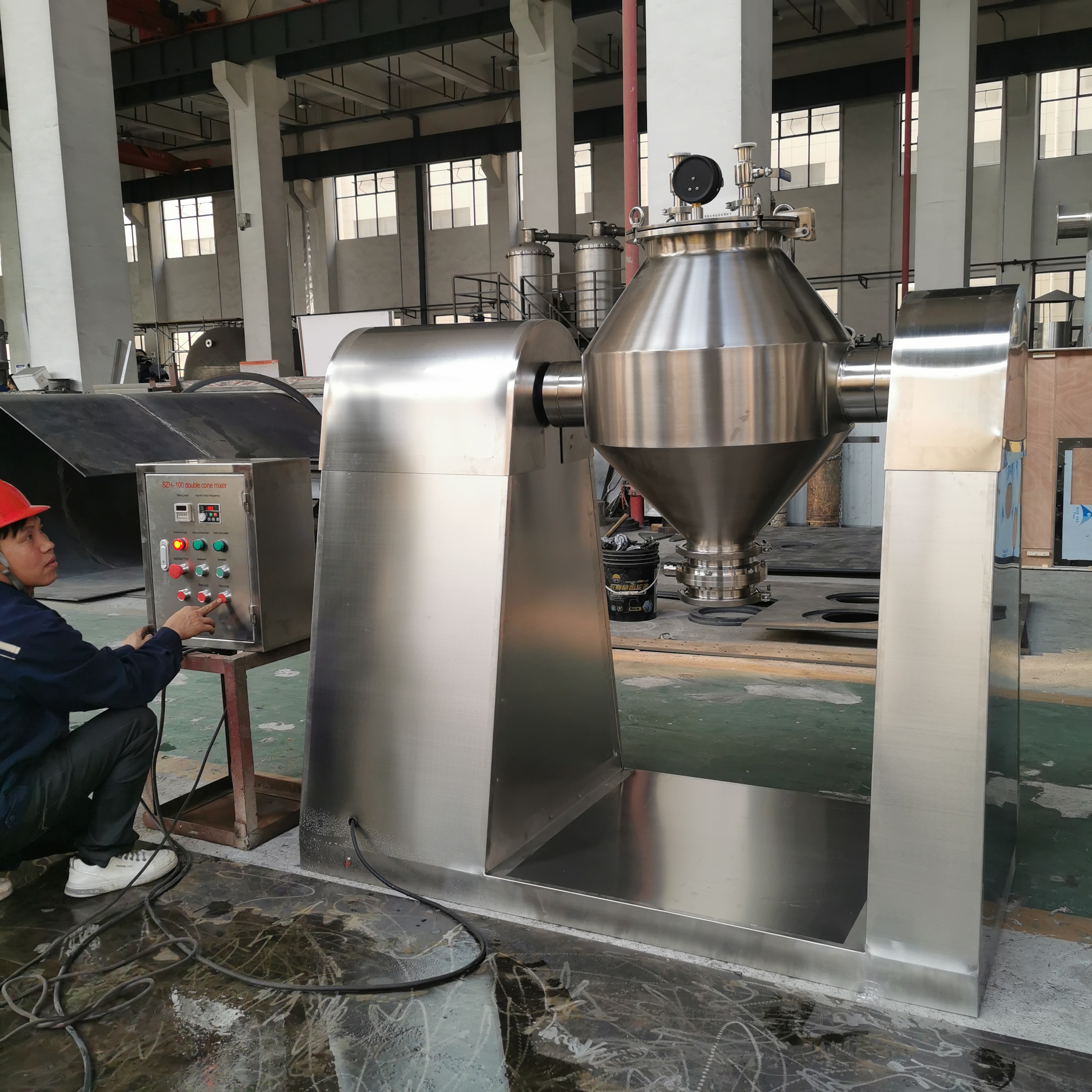 1. The mixing barrel is a W-shaped double-tapered cylinder, and the material is 304-2B high-quality stainless steel plate ring formed by round and close welding, which is more conducive to cleaning the barrel after the material is mixed. Both the inner and outer walls are precisely polished and polished, with smooth surface, no dead ends, thorough discharge, and easy cleaning;