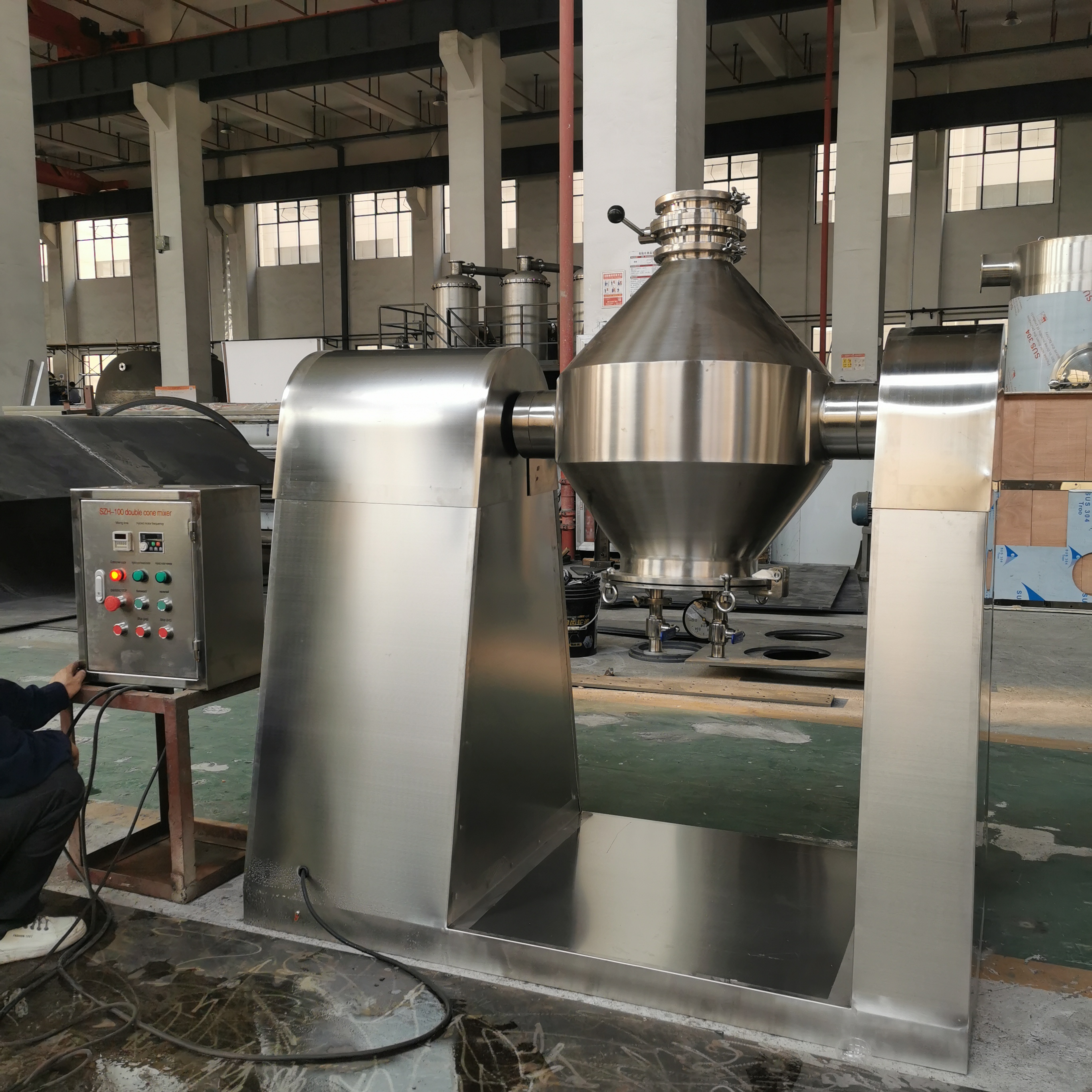 1. The mixing barrel is a W-shaped double-tapered cylinder, and the material is 304-2B high-quality stainless steel plate ring formed by round and close welding, which is more conducive to cleaning the barrel after the material is mixed. Both the inner and outer walls are precisely polished and polished, with smooth surface, no dead ends, thorough discharge, and easy cleaning;