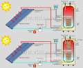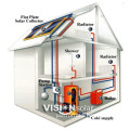 ? 1.?Glazing: Toughened low-iron glass (glazing) protects the absorber from the outside environment while allowing through ≥91% of sunlight. 2. Absorber: A thin sheet of aluminum or copper?is coated with a highly selective coating that is extremely efficient at absorbing sunlight and converting it into usable heat. The?absorber sheet is ultrasonically welded to the copper riser pipes. 3. Insulation: The insulation helps reduce heat loss from the sides and back of the collector. High-density polyurethane and glass wool are chosen by VISION company to greatly reduce weight and heat lost of the collector. 4. Riser & Header Pipe: The header and riser pipes are brazed together to form a harp shaped heat exchanger that the solar system water or fluid circulates through. The absorber sheet is ultrasonically welded to the riser pipes, thus transfers heat to the water or heat transfer fluid. 5. Casing: Anodized aluminum alloy sheet seals the panel and adds to the rigidity of the collector. The rails in the frame are designed for easy mounting attachment. ? Pressure Hot Water Tank A pressure hot water tank with inside heat exchange coil is usually involved in closed loop solar water heater, the storage tank can be placed anywhere inside house. Depending on the system design a single tank may incorporate both solar and auxiliary heating (gas, electric etc) or a dedicated solar tank may supply pre-heated water to a second tank that is heated by traditional energy sources. 1. Water storage tank: Food-grade stainless steel or enamel coated tank keeps the water clean and drinkable, automatic argon-arc welding technics ensures no leakage and long lifespan more than 30 years. VISION hot water tanks have all been immersed in water and tested with 12 bar pressure to ensure no water leakage in high pressure condition. Heat exchanger copper coil inside tank can be connected with collector to form closed-loop for solar water heating. 2. Insulation Layer: High-density polyurethane Integrated-foaming with twice slaking treatment, preserves water temperature constantly 3. Tank shell: Food grade SUS304-BA stainless steel plate, much more durable and beautiful. 4. Accessories: Usually an electric heater is installed in tank for backup heating, and anode magnesium for corrosion resistance, T/P valve and check valve to limit the pressure inside tank for excess pressure protection. ? Solar Pump Station VISION solar pump station is an integrated control system consists of intelligent solar controller, circulating pump, expansion tank, pressure gauge, flow meter, relief valve, check valve, etc. VISION solar pump station makes an simple system installation and intelligent system operation, when temperature discrepancy between heat-transfer medium and main tank water reaches set value, the controller shall start the circulation pump automatically for heat exchange, or start back up heating device to assist solar water heating when colder water presents. ? System Illustration for VISION Split Flat Panel Solar Water Heater: ?