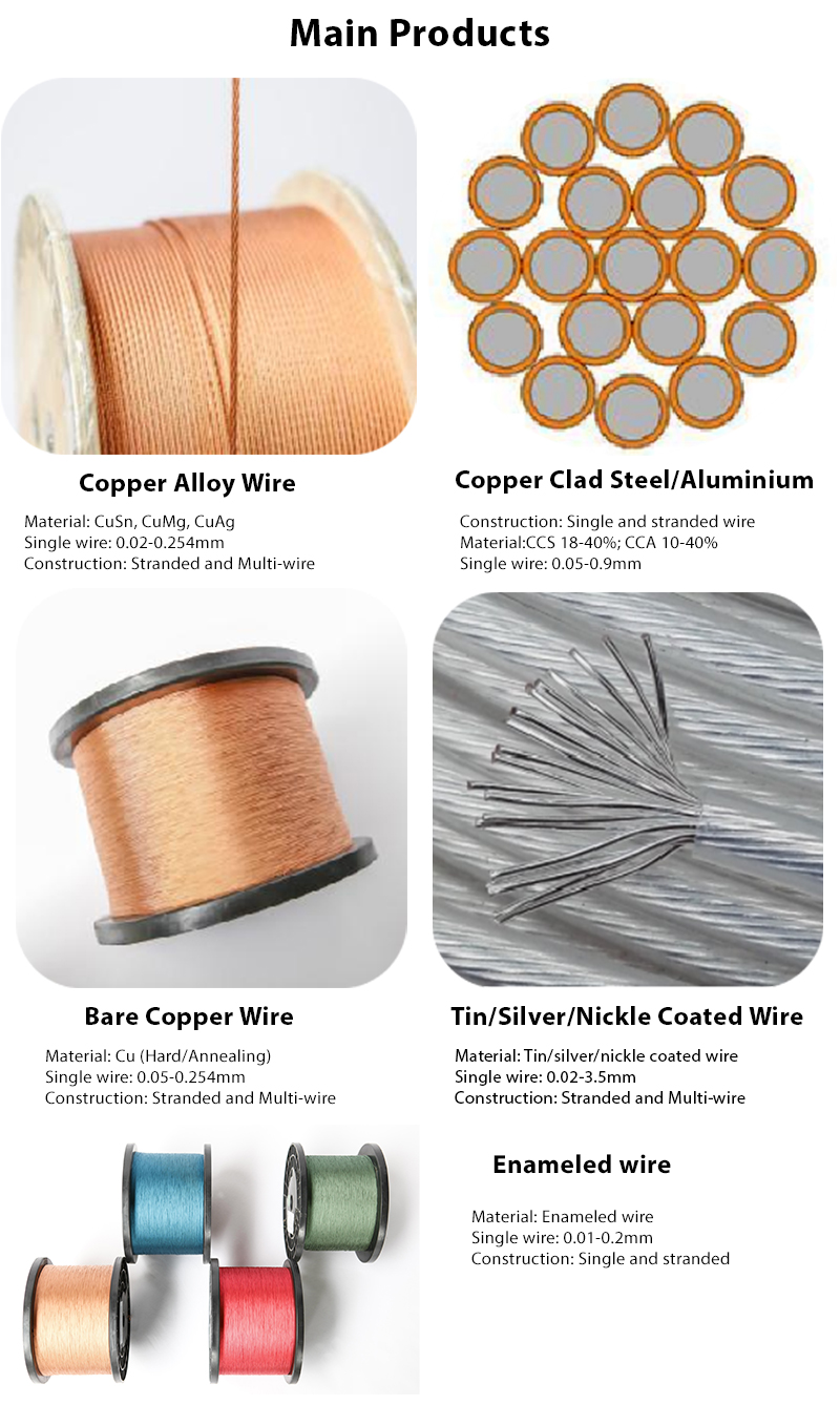 Main product: Copper alloy wire, CCS, CCA, Copper wire, tin/silver plated wire, etc.