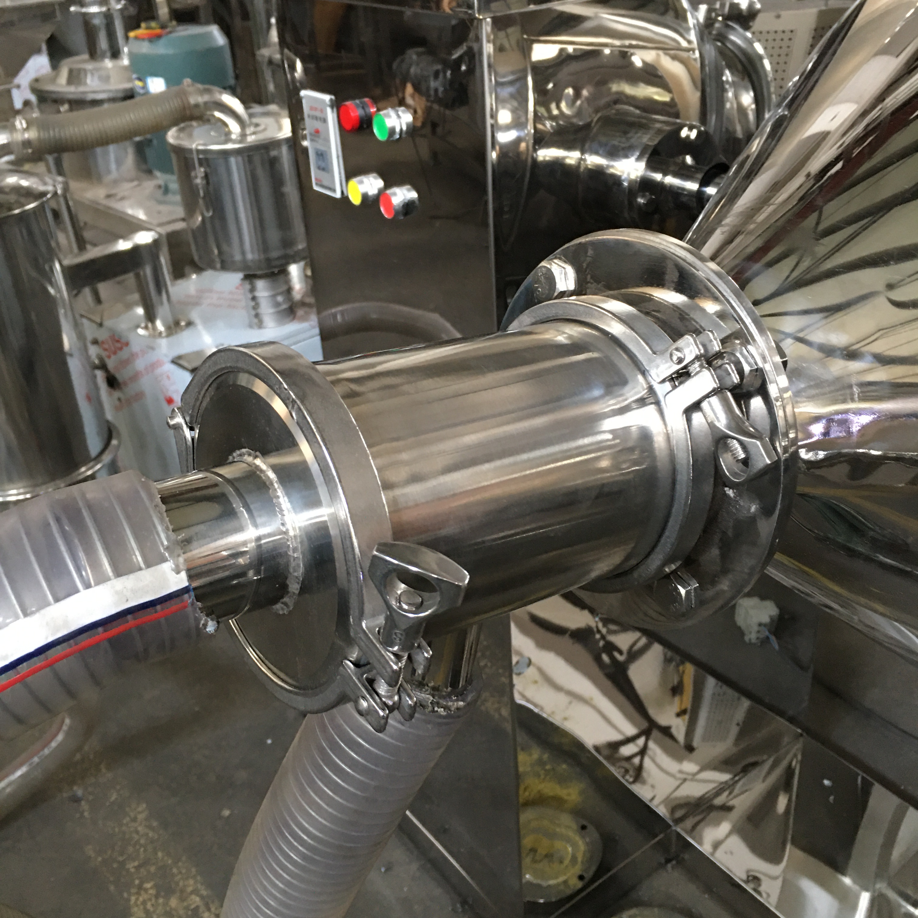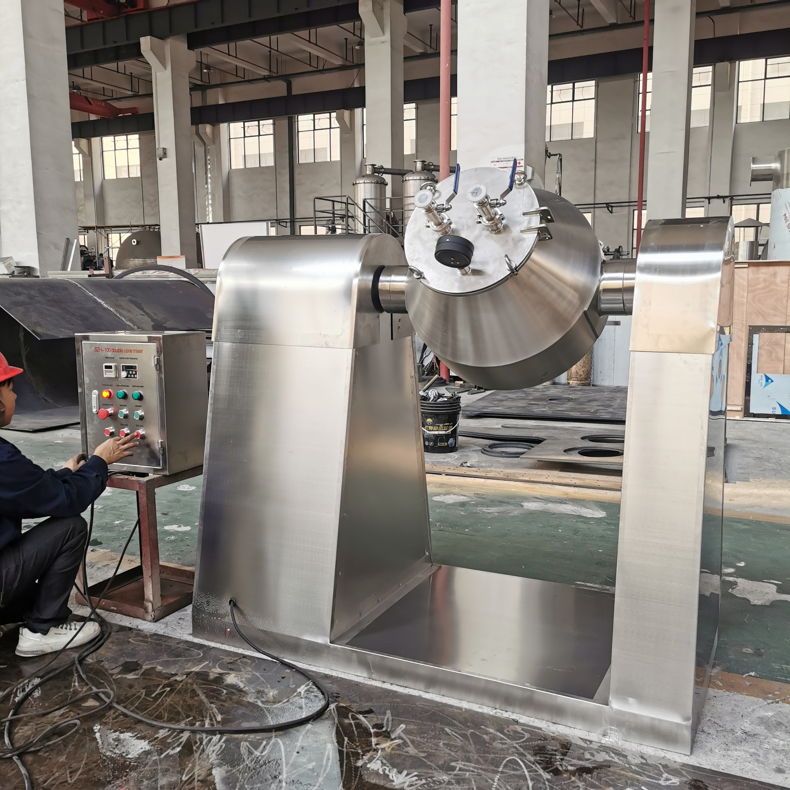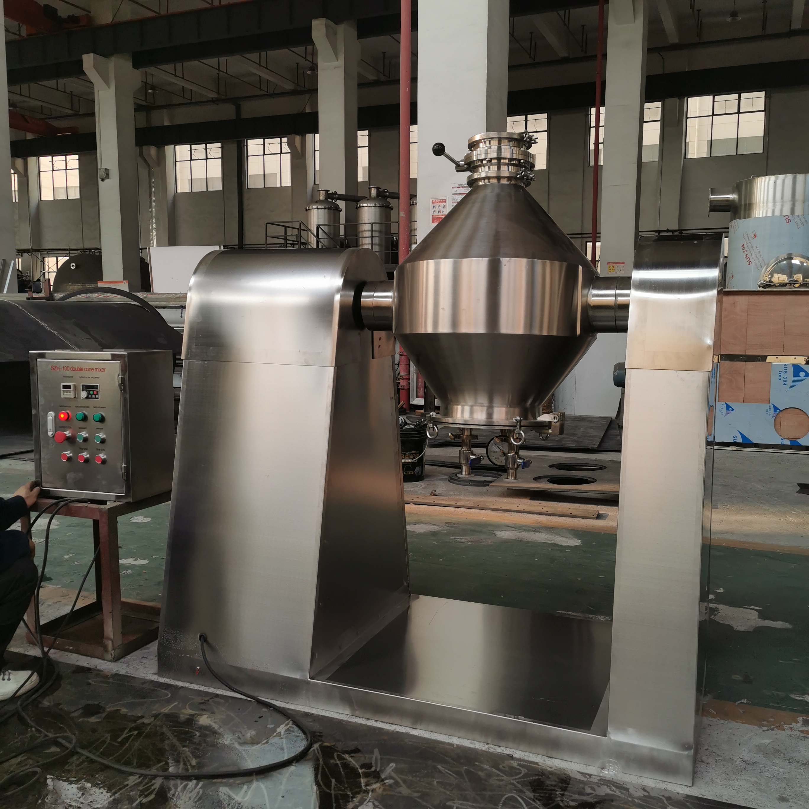 1. The mixing barrel is a W-shaped double-tapered cylinder, and the material is 304-2B high-quality stainless steel plate ring formed by round and close welding, which is more conducive to cleaning the barrel after the material is mixed. Both the inner and outer walls are precisely polished and polished, with smooth surface, no dead ends, thorough discharge, and easy cleaning;