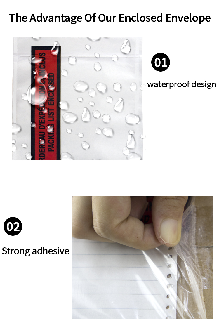Material | Self-adhensive packing list envelope Top Layer : Clear LDPE 30-50 Micron BottomLayer : Clear LDPE 30-50 micron Release Paper : 40-50 gsm with full-face siliconecoating Adhesive : 20-25gsm hot melt. | ||||||