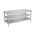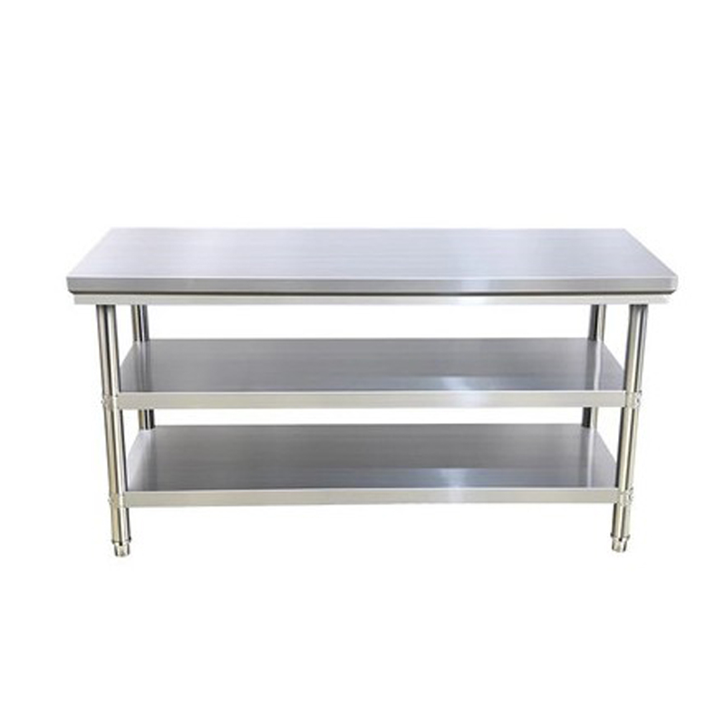 Durable Antirust Three Layer 304 Stainless Steel Work Table, can load about 150kg, with adjustable bullet feet&detachable balcksplash board, using full stainless steel material, will be waterproof and not easy to be rusty, all edges finished for safety.