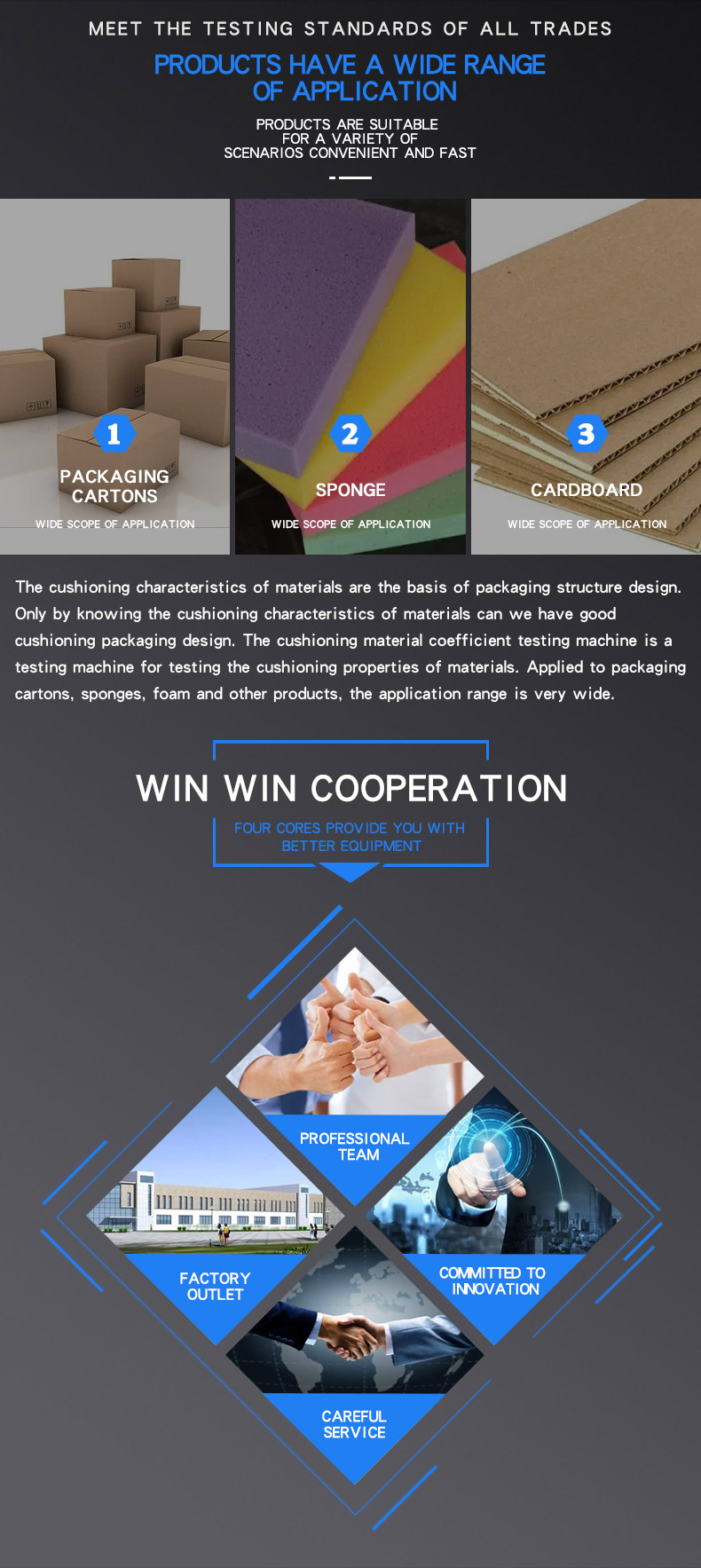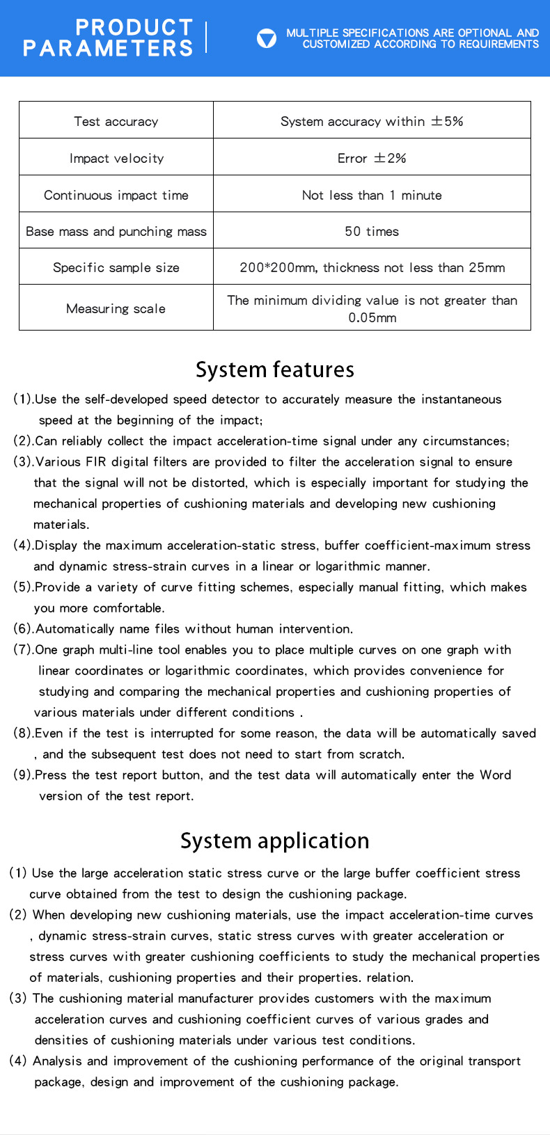 characteristics of materials can we have good cushioning packaging design. The cushioning material coefficient testing machine is a testing machine for testing the cushioning properties of materials. Applied to packaging cartons, sponges, foam and other products, the application range is very wide.System features