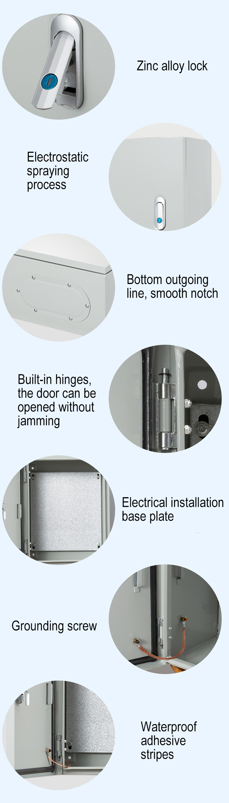Strict standards, multiple protection, quality materials, support OEM customized size, material, thickness, opening, color, type and other requirements. The whole is formed by fully automatic CNC bending, with smooth surface, rust prevention and compression resistance. Adopt electrostatic spraying process. The incision is smooth, with waterproof tape inside, which is dust-proof and waterproof.