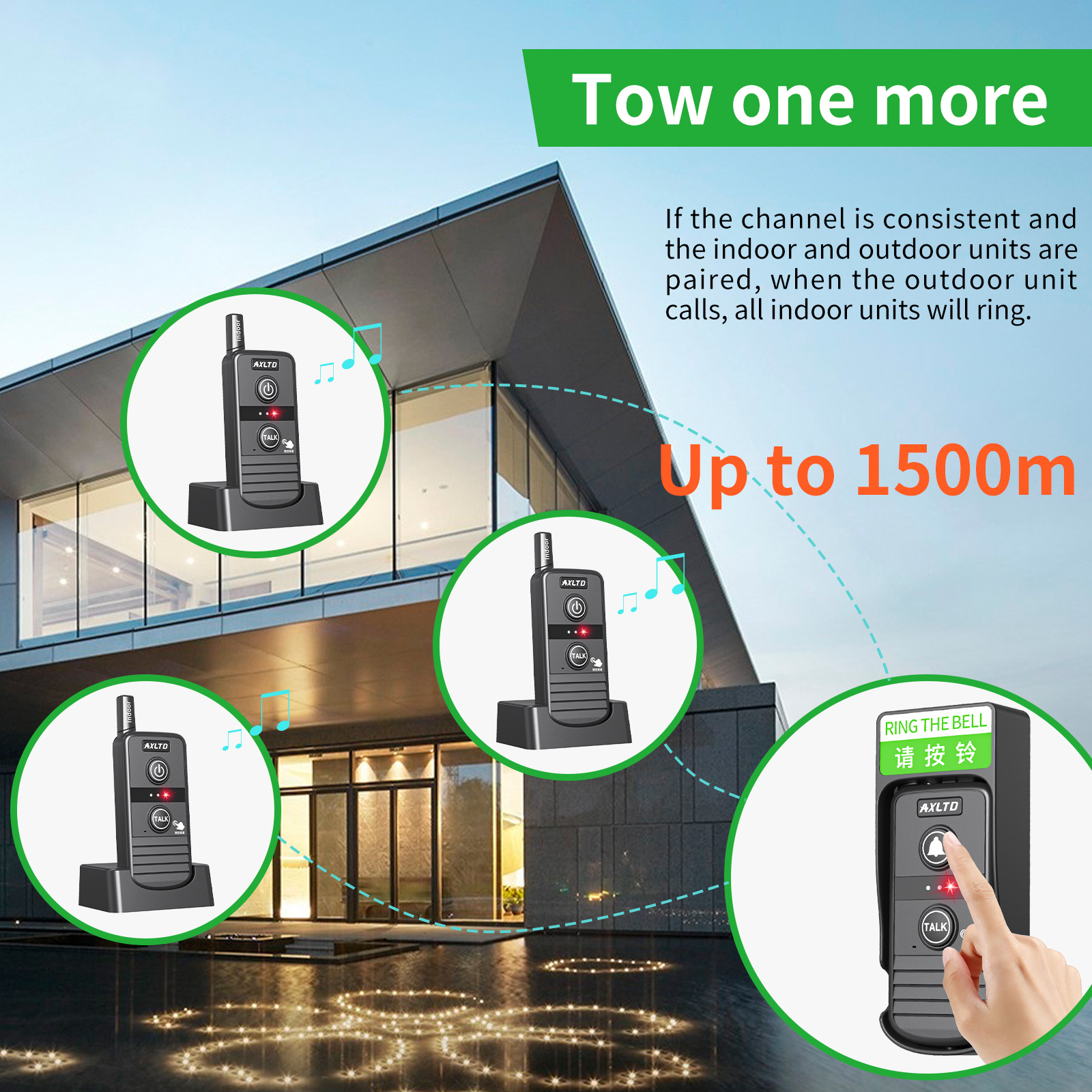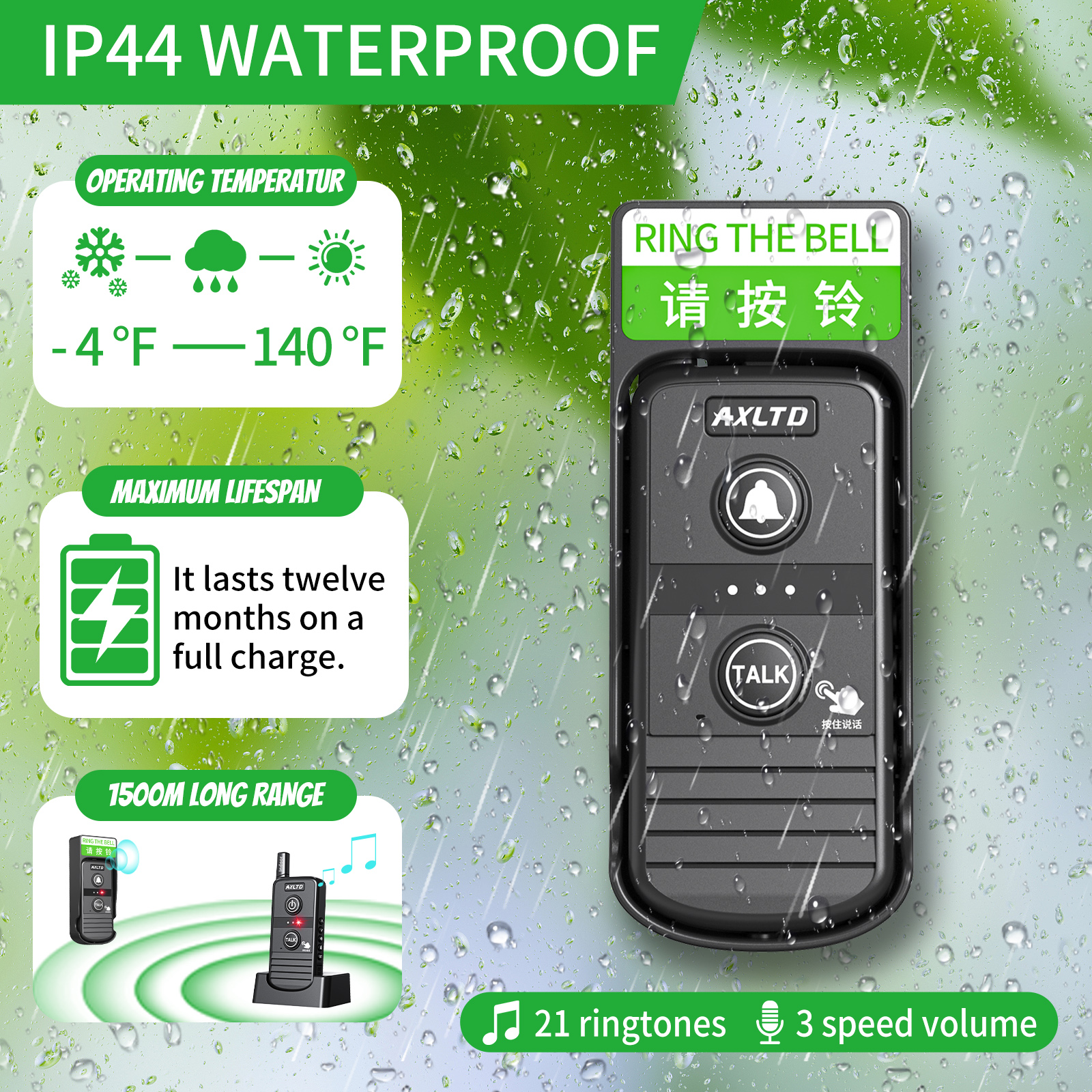 Wireless Doorbell with 1500m Range, Waterproof, Two-Way Communication, and 3 Volume Levels1