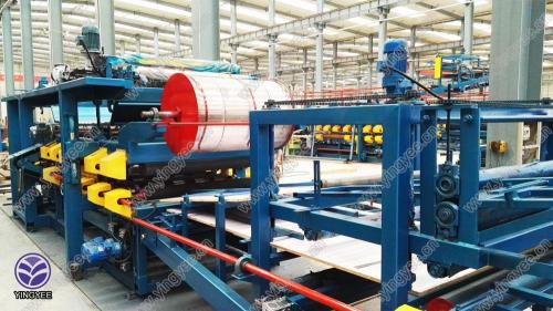The whole production line include the roof and wall panel roll forming machine, glue process, sandwich panel process, cutting.