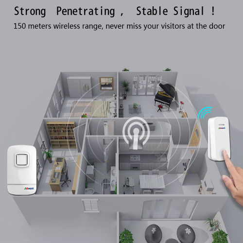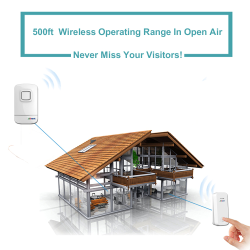 - The operating range of this plug-in wireless doorbell is up to 150 metres on open air, which is applicable for villa, multi-story houses or big property.