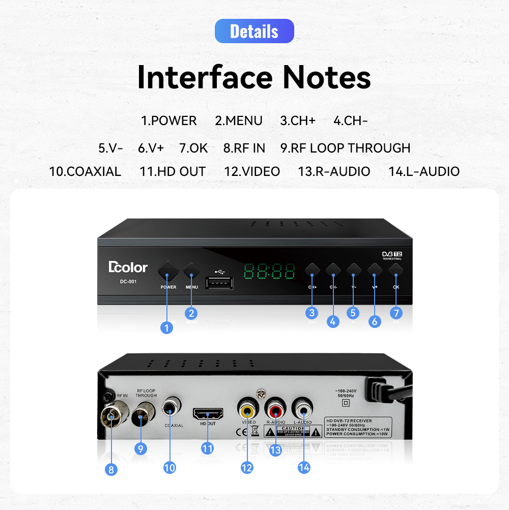 9. Supports HD output, scart or AV output, coaxial, RF in and output |