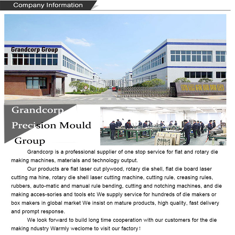 Grandcorp is an excellent Taiwan founded die making group-company. There are totally 23 subsidiaries for Grandcorp. It had engaged in die making industry for more than 20 years and now had customers from around the world and supplies the best quality goods to customers. You will be easy to find the rotary die board, flat die board, rotary die, flat die, auto-cutting die, precise cutting die for electronic, die making machine and tools, packaging and printing material machine and tools. More information please see our website: http://