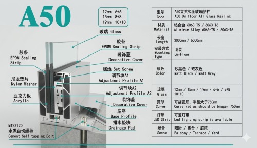 The A50 On-Floor All Glass Railing system represents the pinnacle of modern architectural design. As a professional Aluminum Railing System engineered with high-strength 6063-T5/T6 aluminum alloy, this structural balustrade solution provides a seamless, transparent view and robust safety for prestigious residential and commercial projects.