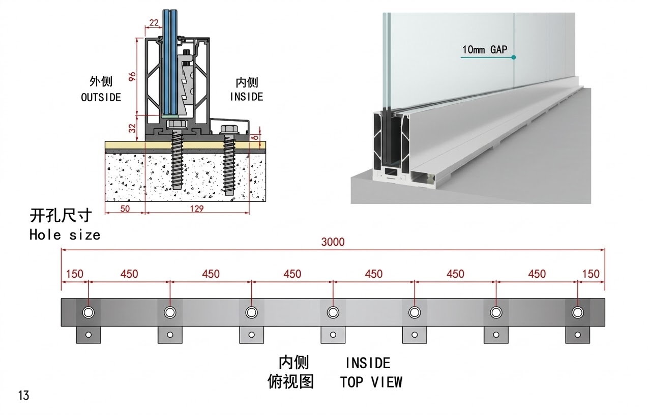 A versatile structural base shoe. Compatible with monolithic glass (12mm, 15mm, 19mm) or laminated safety glass configurations (6+6 / 8+8 / 10+10), adapting to your safety needs.