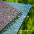 ? ? ? ? On the basis of common pc solid sheets technique and improvements of molds and production, the optical ? properties are changed as the surface structure of the product varies. Single side of pc embossed sheet ? contains UV protective layer, therefore, its mechanical properties, fire retardation, applicable temperature and ? chemical properties are consistent with common solid sheet. By changing the physical shape of the surface, ? when light gets through the embossed sheet, it produces light scattering to get a vague hazy effect. Currently, ? pc embossed sheet is very ideal architecture material. ? ? ? ? Features of Product ? ? ? ? 1. Light transmission Polycarbonate sheet has very good light transmission. Prolonged sun exposure of UV coated plate does not produce yellowing, fogging and poor light. The loss of light transmittance is 6% for embossed sheet and 15%-20% for PVC after ten years. As light through its convex particles produces light scattering, it has good optical effect. For more information about light transmission, please feel free to contact us. ? ? 2. Anti-UV & Heat Insulation UV protective layer, 98% UV absorbed. ? ? 3. Light weight, high impact strength,excellent physical and mechanical properties and well bending performance The mechanical properties of pc embossed sheet are consistent with pc solid sheet. Maintaining good impact resistance for a long time in a wide temperature range (-40°C-120°C). ? ? 4. Fire retardation Embossed Polycarbonate?sheet meets the national standard GB8624-1997 and ranks at B1 retardant material level. In the process of combustion, the sheet does not produce any smoke and toxic gases, and automatically turns off from the fire. It has good fire retardant properties. ? ? 5.Wide-ranging application, good weather-resistance Maintaining the stability of mechanical properties between -40°Cto +100°C, the sheet does not occur the cold crisp above -100°Cand without softening below 145°C. Small size change from 100°Cto -40°C, the rate of change is ≤ 0.3%. 2000 hours of artificial aging test towards the sheet, the yellowing degree was grade 2, and the transmission rate was decreased by 0.6%. ? ? 6. Soundproof The sheet can effectively reduce the noise, and is the best choice for soundproof. ? ? ? 7. Convenience for transportation and construction Light weight, standard size, convenient transportation & construction, easy cutting and punching, cold bent and good processing performance. ? ? 8. Condensation inhibition Under normal circumstances, when the outdoor temperature is 0°C, room temperature is 23°Cand the indoor relative humidity is below 80%, the inner surface of the material does not frost. ? ? ? 9. Chemical resistance Polycarbonate Sheet can resist various kinds of harmful corrosive materials, such as organic acid, inorganic acid, vegetable oil, neutral salt solution, aliphatic hydrocarbon and alcohol, etc. ? ? ? ? Storage, transportation and usage ? ? ? Prohibit contact with wet cement surface and acid, alkaline material surfaces. ? Prohibit contact with organic solvents and glue, paint composed thereof. ? Keep the frame clean and the surface of rabbet groove flat. ? ? ? ?