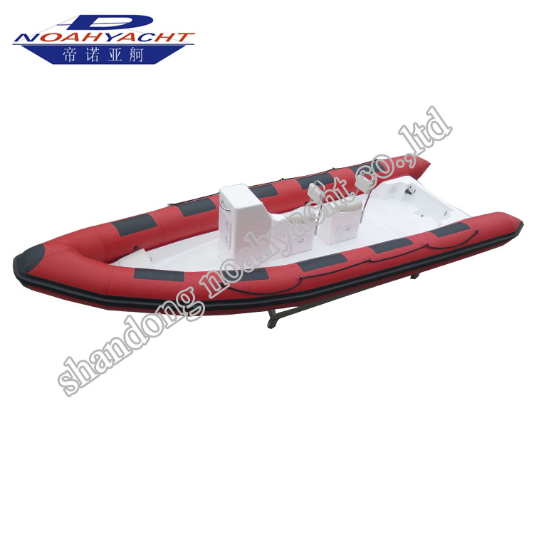 Large fiberglass Rib Inflatable boat with bow locker is a popular deep v hull fiberglass hard bottom dinghy boat made by shandong noahyacht co.,ltd . The features of this jockey centre console fiberglass boat is a little narrow on the bow , and v angle is much deeper , and can split water well and runs faster on the sea .The tough Rib boat 640T hypalon rigid fiberglass hull are anti-corrosion and rugged durable. Transom is designed for long shaft outboard motor .
