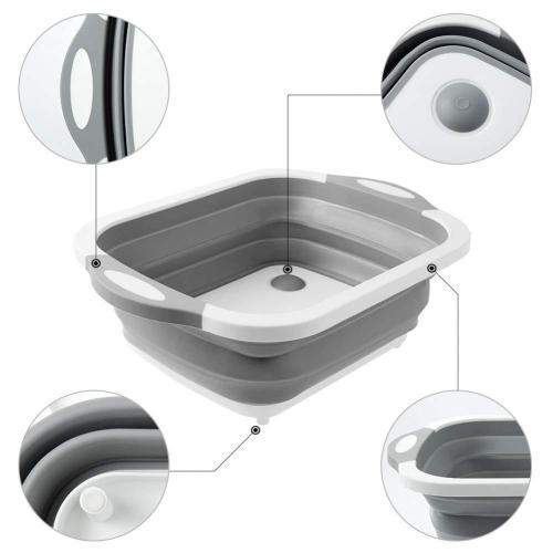 FEATURES: Can be used as a cutting board after folding or vegetable washing basket and drain basket after opening. Integrated plug and drainer, simply twist plug to drain water. Non-slip design at the bottom can keep the dishpan steady and firmly, the contoured ergonomic handles make pick-up easy for scraping ingredients into a pot or waste into the trash