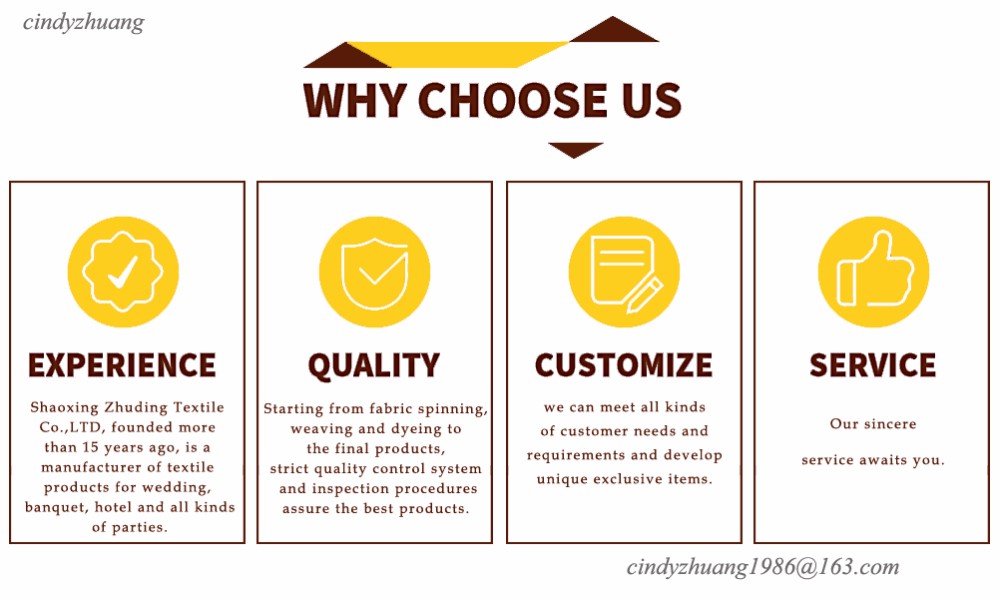 ? ? ? ? ?Shaoxing Zhuding Textile Co., Ltd is located in the famous China Textile City---Keqiao, ?We are a professional manufacturer of chair covers, chair sashes, table cloth, table runners, napkin,etc. for hotel,wedding, banquet , outdoor, home,conference, party and other special events.