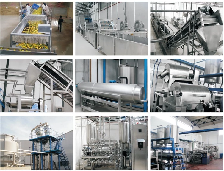 Concentrate mango pulp production line is equipped with washing machine, sorting machine, de-stoner, pre-heater, refining machine, vacuum?evaporator, sterilizer, aseptic filler/can filler/carton box packing machine.