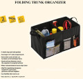 Item: Polyester,600D polyester Material and Trunk Organizer,foldable Type trunk organizer ? ? ? ? ?Trucks, SUVs, and many types of cars can haul a lot of cargo. But if you don't want to soil the carpet or damage the interior, the Car Trunk Organizer is an extra-large, premium-quality organizational solution that is durable and easy to use. ? ? ? ? The exclusive, spring-loaded, self-opening system makes it a breeze to pop open, so set-up is quick and easy. ? Product Description ? Product?Description:? ? Item Name | Car Trunk Organizer |