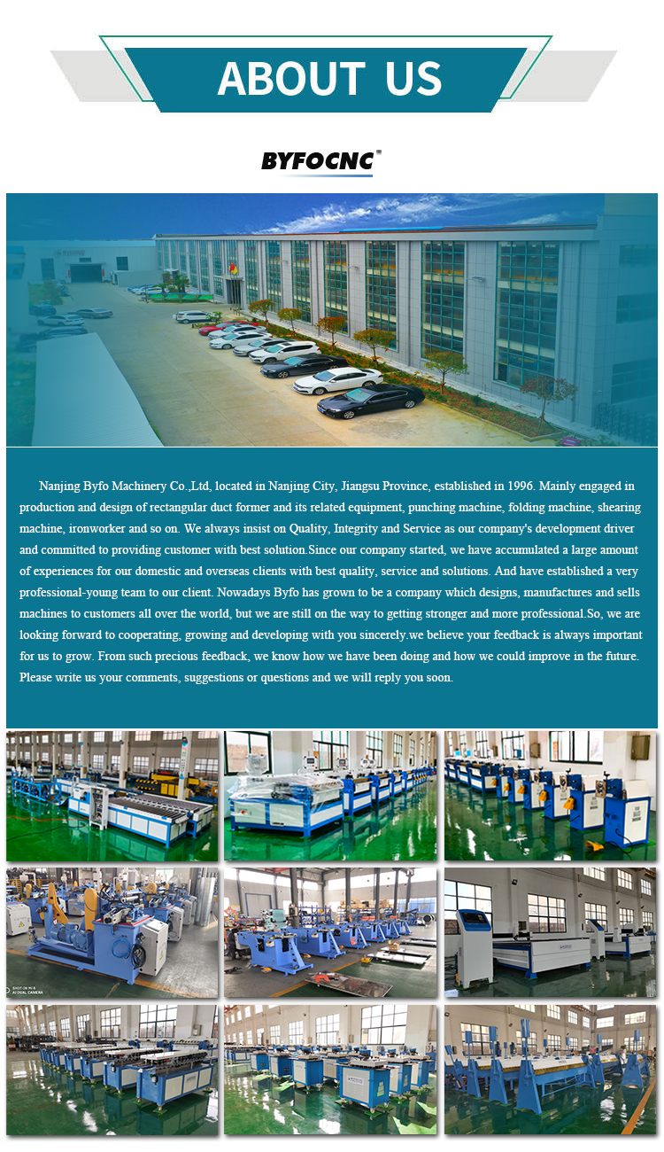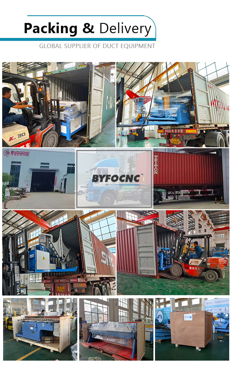 1. Auto duct line II usage and maintenance: Re: Auto Line III is totally desighed and manufacture by BYFO, for usage and maintenance , please read and study as follow in link : https://www.byfomachine.com/news/precautions-for-daily-use-and-maintenance-of-the-hvac-duct-production-line-3-of-byfo-company-24.html 2.Possible failure problems and solutions of duct production line 2: Re:Improper use by customers may cause some problems with the machine, please read and study as follow in link : https://www.byfomachine.com/news/Possible-failure-problems-and-solutions-of-duct-production-line-3--25.html 3. What’s the shipping cost from China to your country? Re:We can send machine to your port or door address by sea or airplane. Please kindly tell us your nearest port or address with postcode.We have reliable shipping agent to insure the safe, convenient and timely delivery. 4. Payment terms, MOQ, warranty, FOB. Re:Payment terms: 30% TT paid in advance, the balance of 70% before the shipment. Minimum order quantity: 1 set. Warranty: 24 months. FOB: Nanjing / Shanghai/or others port in CHINA. 5. What’s the package? Re:Fumigation-free plywood case or without package. 6. What about commissioning service? Re:We can offer commissioning service, the buyer need to afford air tickets. 7. What’s policy for guarantee and broken parts? Re:Warranty period of equipment lasts two year, during which the broken parts and spares caused by quality can be offered free. | ||||||||