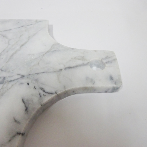 This marble chopping board works well as a chopping board in the kitchen or as a serving platter for cheeses and snacks. The cooling properties of marble also make it ideal for pastry. Each of these boards is unique, and comes in a white pearlescent finish. When not in use, it can be hung or stored flat.