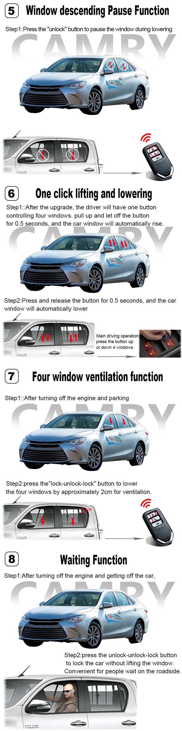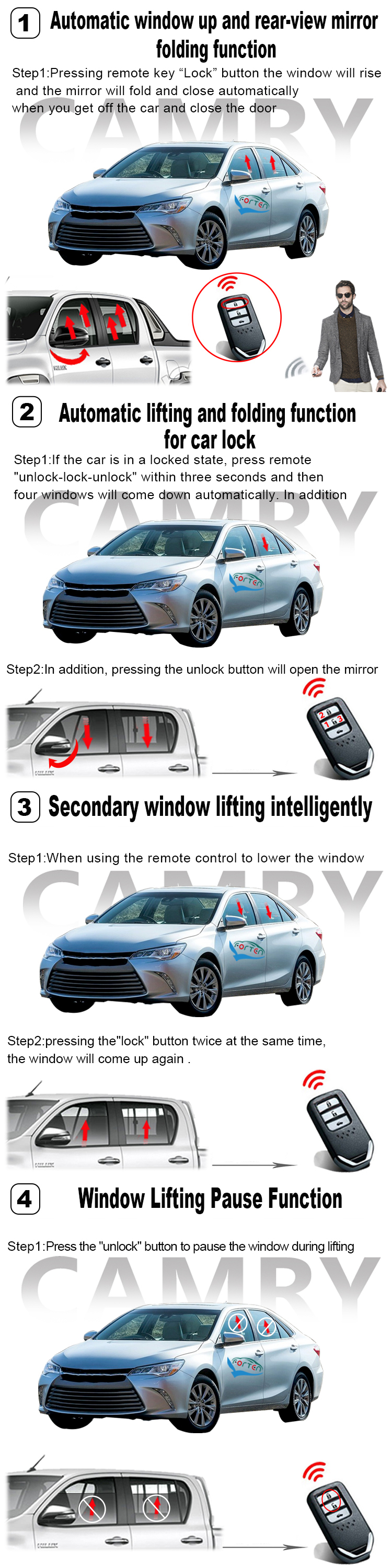 Function 01: After get off the car and close the doors well , Press remote key “ lock” button , the windows will close automatically.