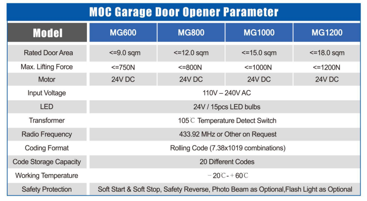 MOC Roller Door Opener Electric Specification