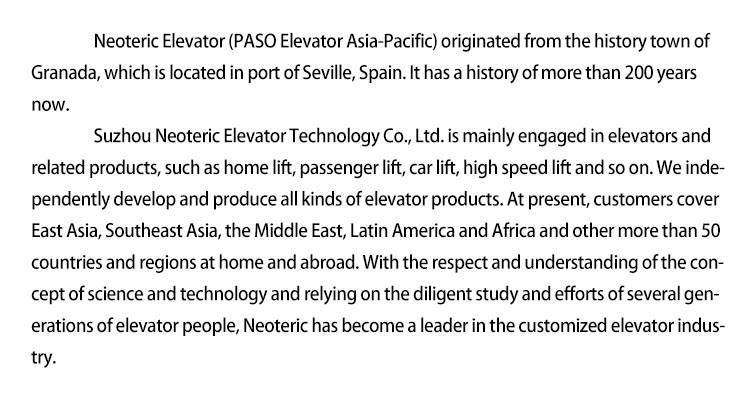 Based on scientific and technological innovation as the driving force of enterprise development, Neoteric with its strong technical development ability, mastering modern elevator overall design, the core manufacturing technology, through the design of the control system, increasing scientific and technological content of products, in order to achieve energy saving and environmental protection technology and high performance type elevator. Adhering to the development idea of "technology driven future", we have to "focus, innovation and excellence" enterprise culture, adhere to the "customers first" principle, continue to innovate and improve, with high quality products and professional pre-sales and customer service service, provide systematic solution, and strive for every customer experience tailored passenger elevator.