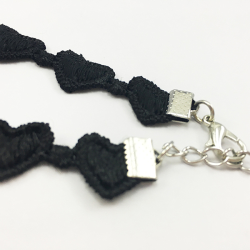 The material of this necklace is made of black lace. The lace pattern is very beautiful, It is made up of series of hearts. The width of this black lace necklace is 1.3cm, the length is about 29cm, and the length of the extend chain is about 6cm. There are many similar black lace necklace can be produced, if you want, please feel free to contact us to ask more nice pictures. The Detail drawing pictures of this black lace necklace as following.