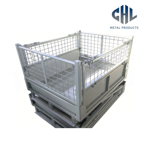 The cage excels in durability and operational flexibility. Its stackable frame with interlocking pallet-style base enables secure vertical stacking, maximizing warehouse storage density without compromising stability. The wire mesh side panels allow for easy inventory checks and airflow, preventing moisture buildup, while the solid base ensures secure containment for small or loose items, mirroring the resilience of a heavy-duty tooling cart. The hinged, latch-secured side gates simplify loading and unloading, enhancing workflow efficiency. Though not a mobile transport trolley, its forklift-compatible base supports seamless material movement between workstations, integrating smoothly into logistics operations.