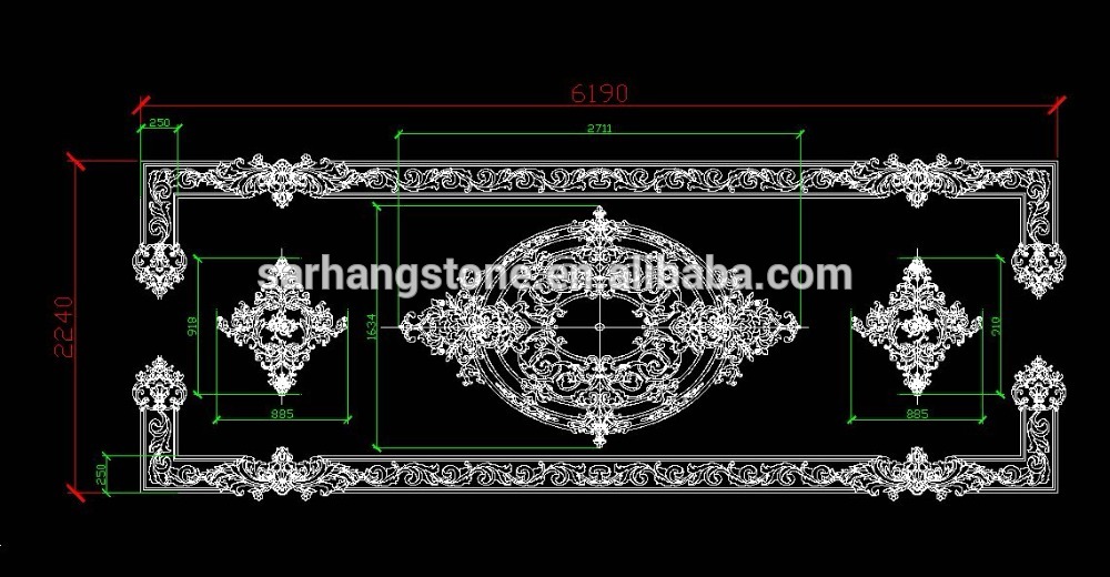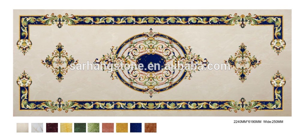 Product Description Sarhang stone is the World Leader designer and producer of Custom made Large Natural stone (Marbles) tile Floor Medallions, floor tile borders, custom floor inlays, and Porcelain floor tile medallions (often referred to as Mosaic medallions) with focus on durable high end residential applications. We offer Polished or Honed Marble wall or flooring medallions in a variety of sizes, styles and options, made with natural stone, travertine, marble, granite, exotics, Glass, Metals and porcelain tile. Any design may be Fabricated, Round, Square, Oval, Rectangular, Radiused, no problem in any size Big or Small. Your completed projct will become a statement of opulence your quests will admire. We have many wall and floor tile border inlay styles.