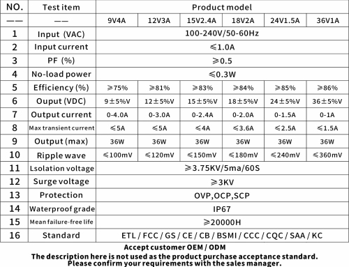 | Test Item | 12V4A | 15V3.2A | 18V2.67A | 24V2A | 36V1.5A | / |