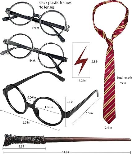 Harry Costume Wizard Accessory Set: A full set of 9 cosplay Wizard accessories make you stand out at the Halloween dress up party, cosplay and wizard themed parties, accessories come with 6 tattoo stickers, 1 eyeglass frame (no lenses), 1*Wizard striped tie, 1*wand.